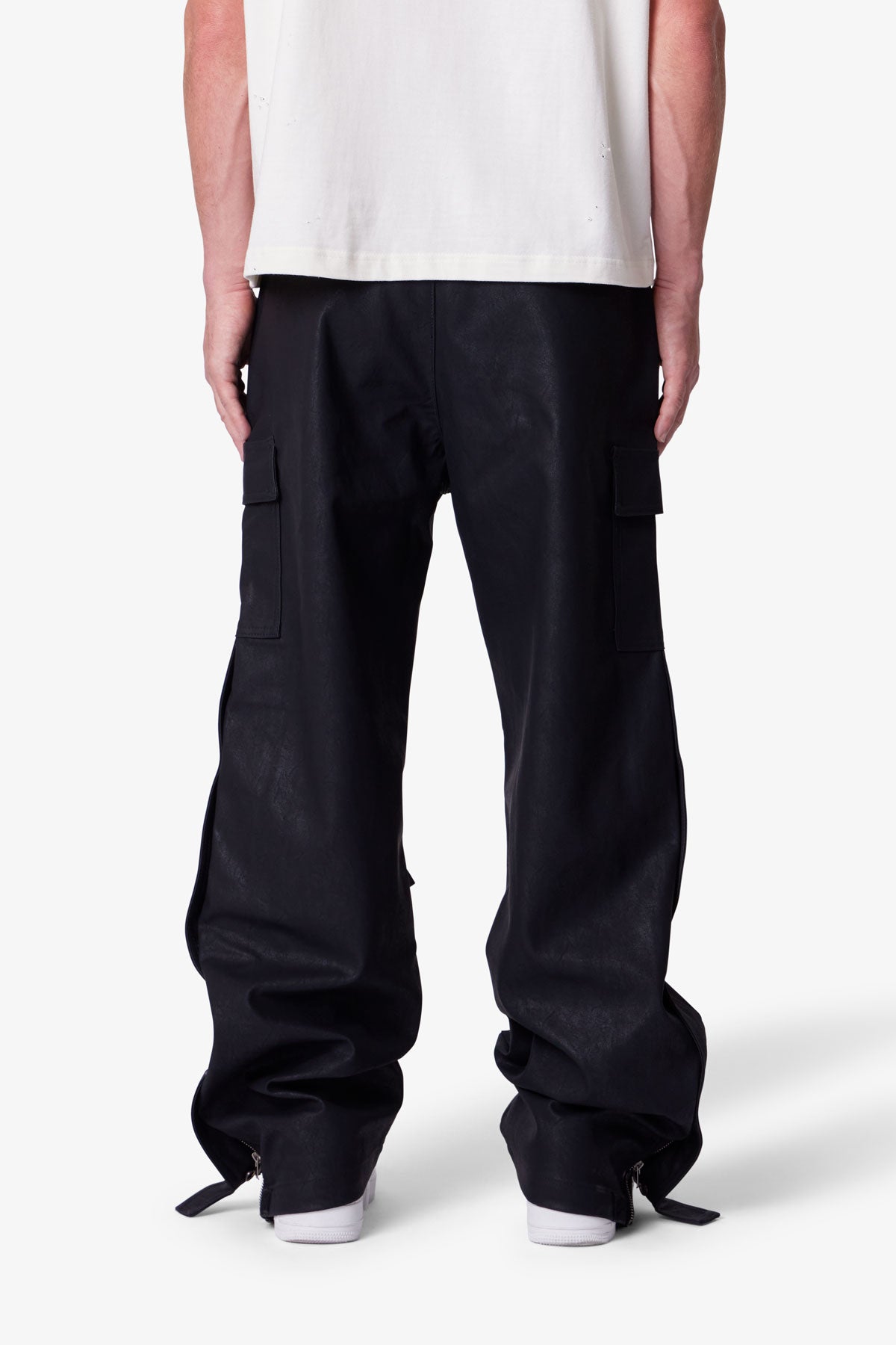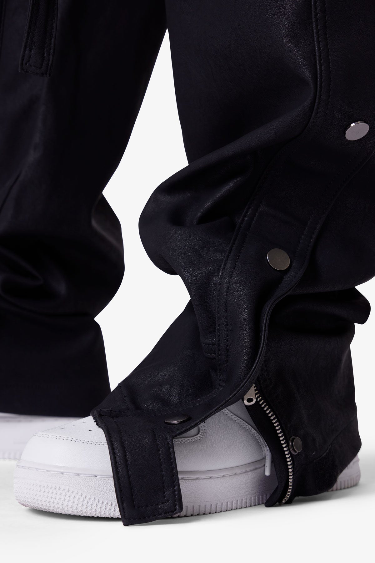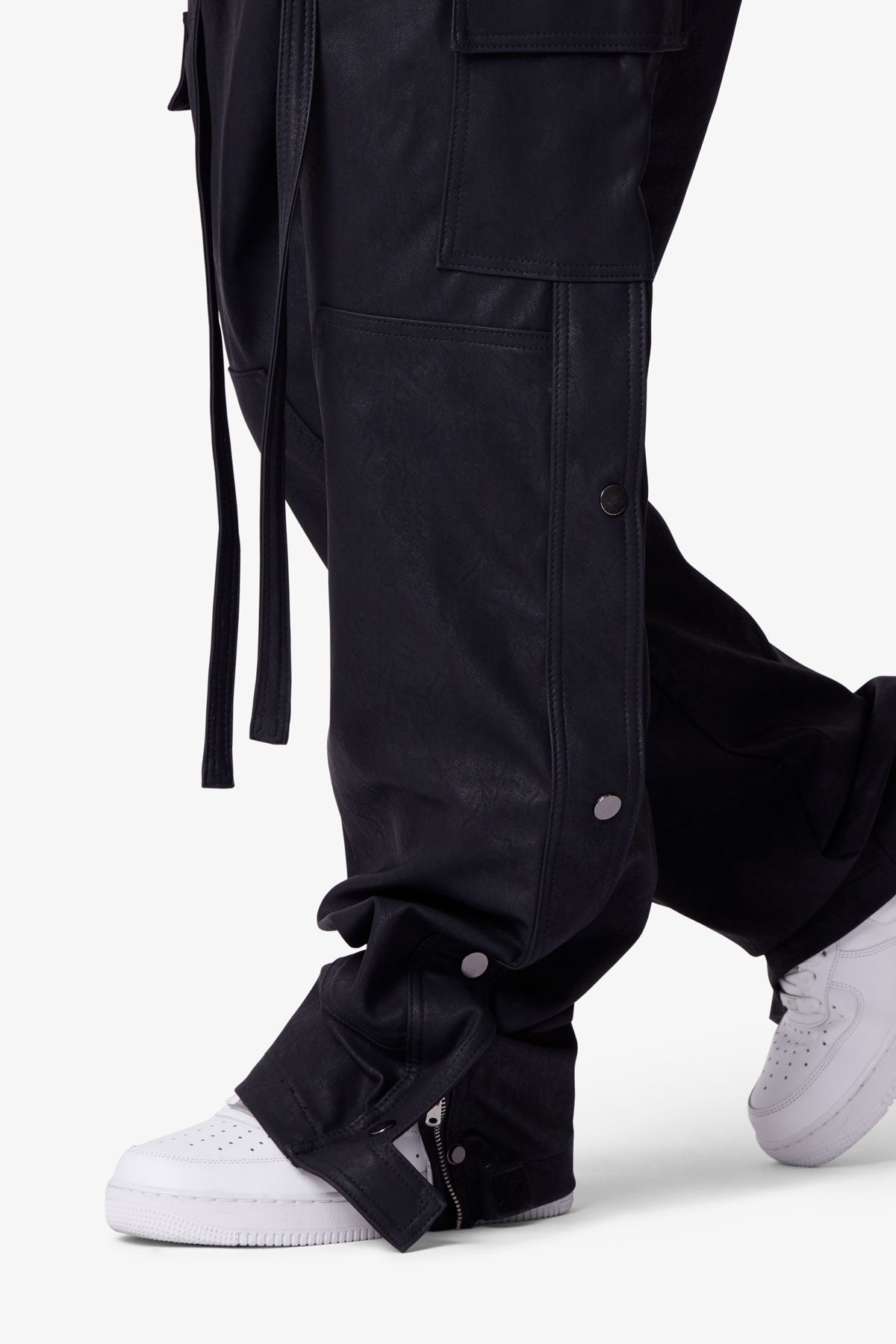 the Ultra Baggy Leather Snap Cargo Pants are designed with an oversized, baggy fit, constructed from a washed synthetic leather fabric, hidden snap closures on the cargo pockets throughout, snap details at the outseam, self fabric integrated belt, and finished with a zipper fly.