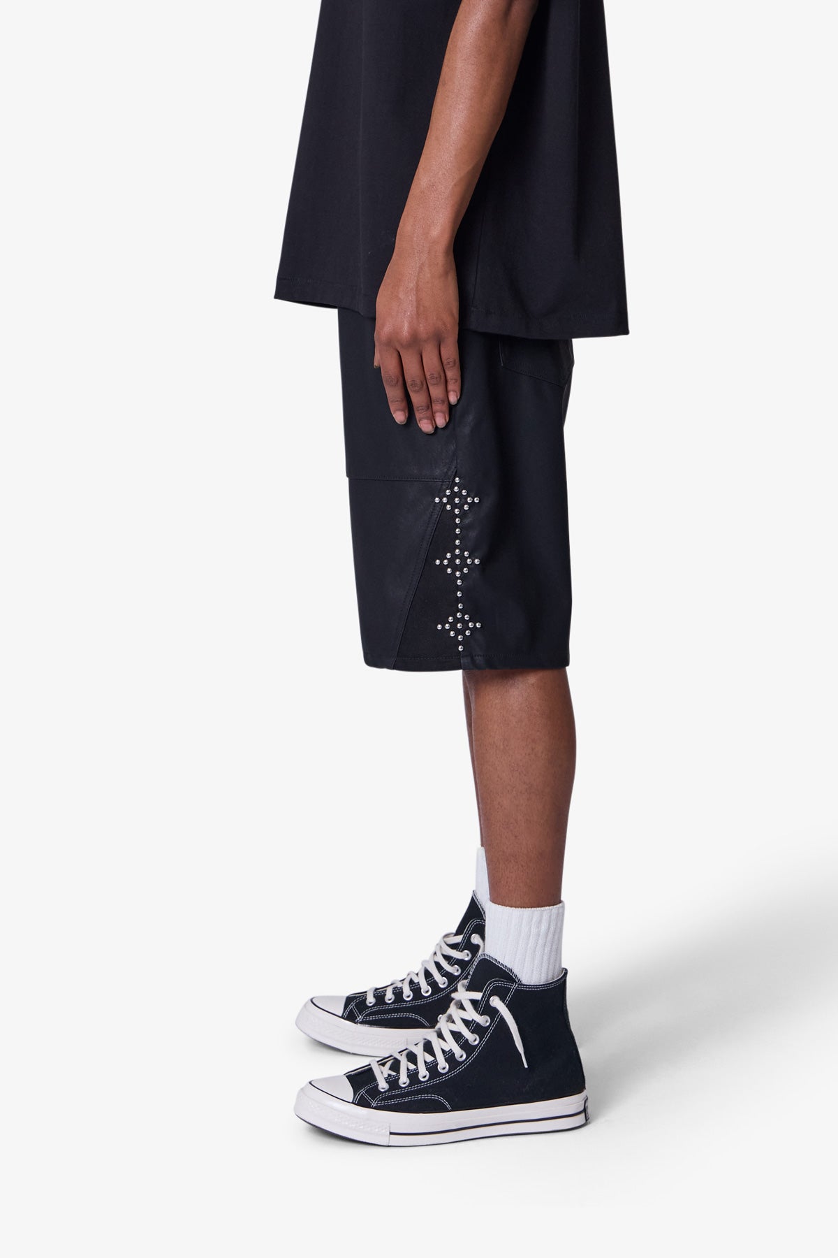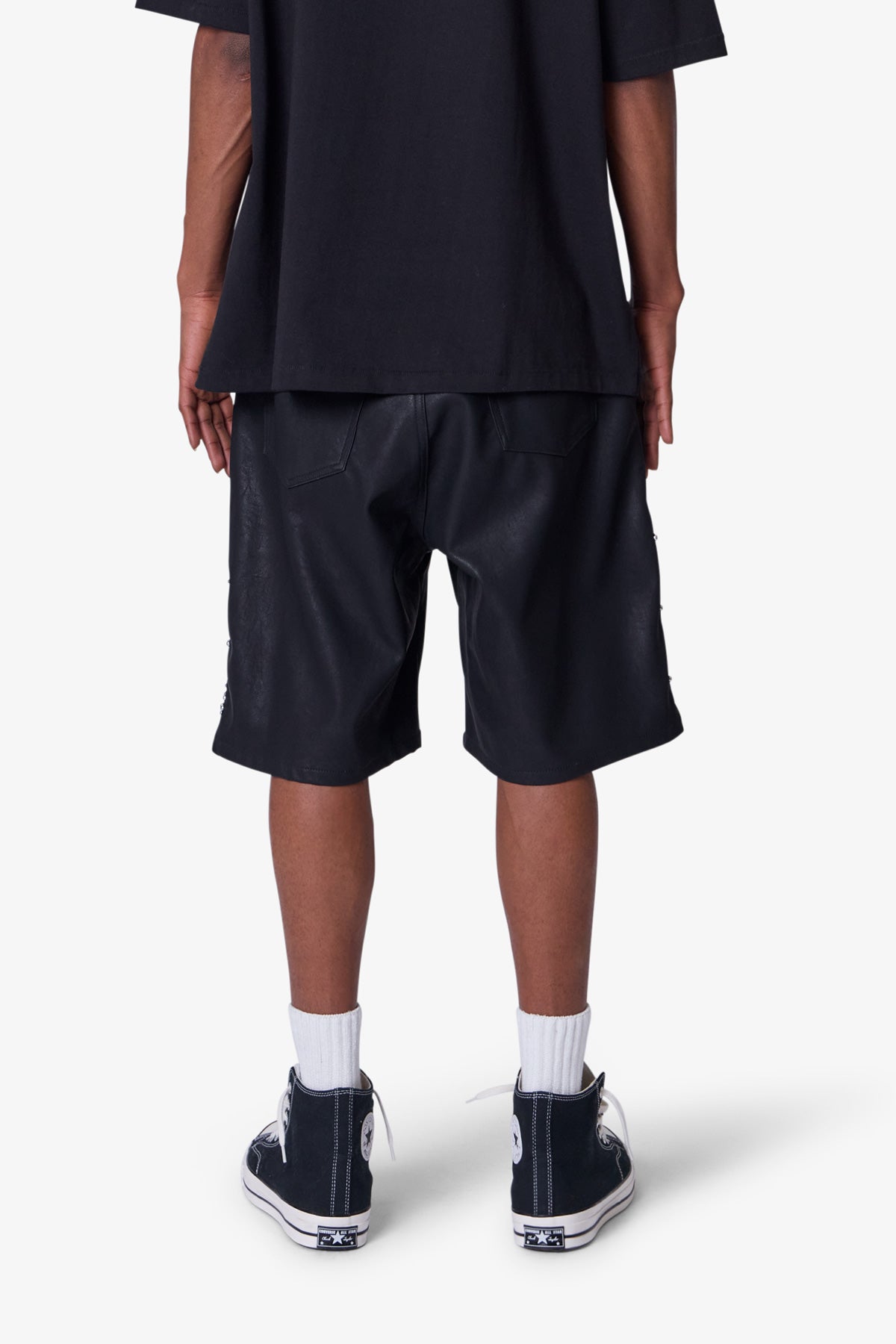 the Ultra Baggy Leather Studded Shorts are designed with a new oversized and baggy fit that is relaxed throughout, featuring studding details throughout, finished hem at the leg opening, and constructed in a vegan leather fabric.