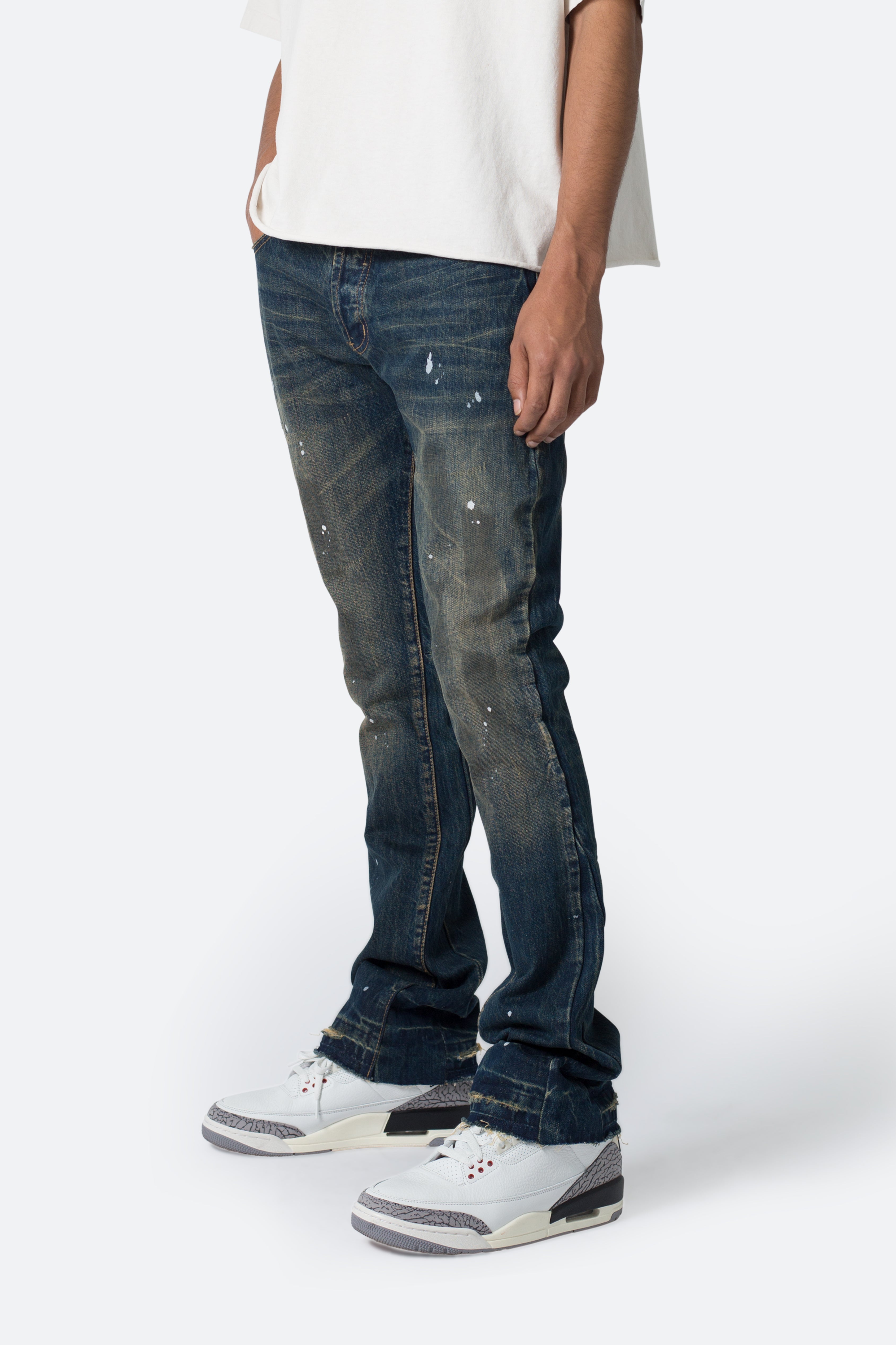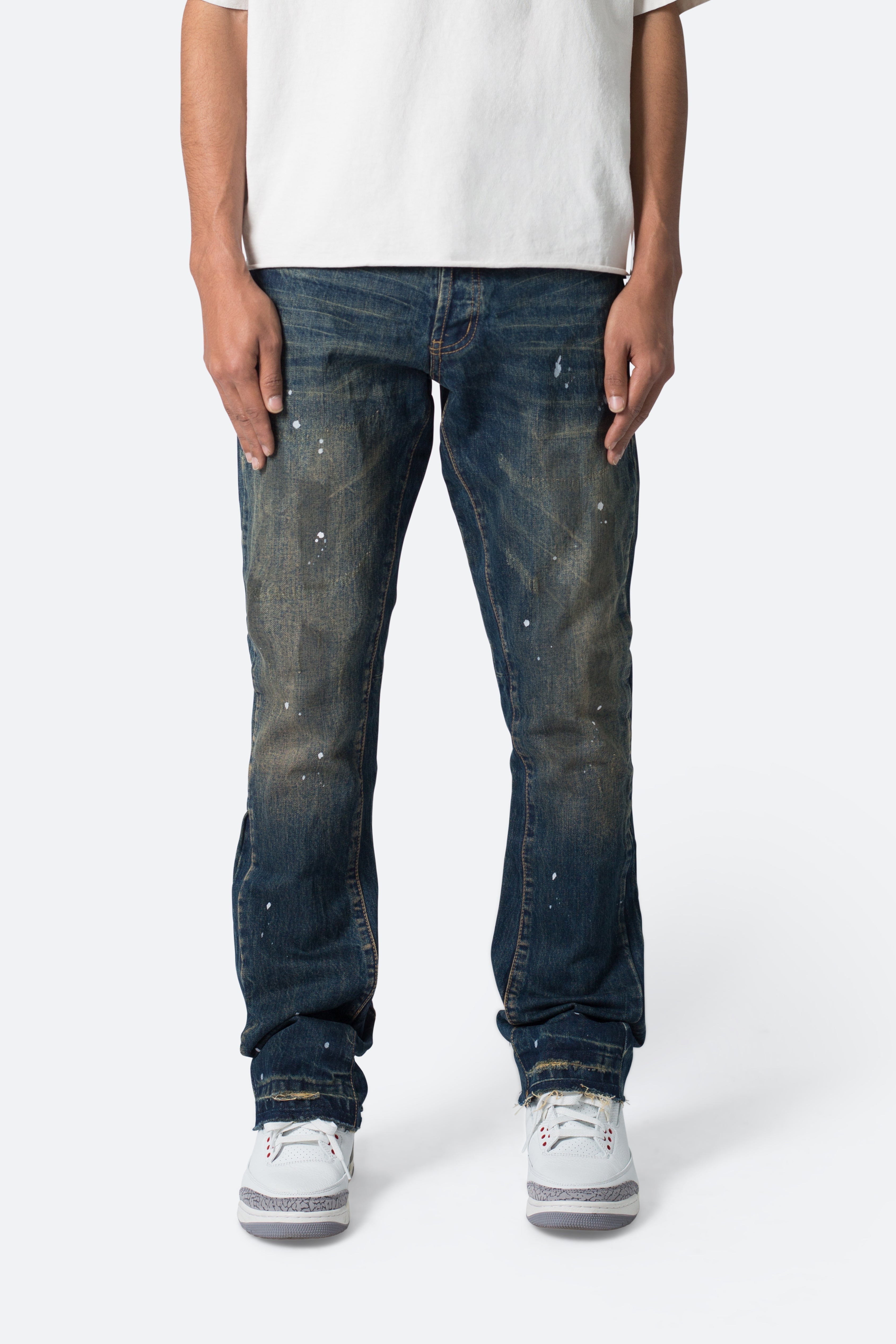 the B614 Flare Denim are designed with our new B fit, which is slim through the thigh and features a slight flare at the leg opening and is constructed from dark washed blue denim, paint details throughout, panelling at the inseam and outseam from contrasting self denim for a slight flare and finished with a deconstructed hem.