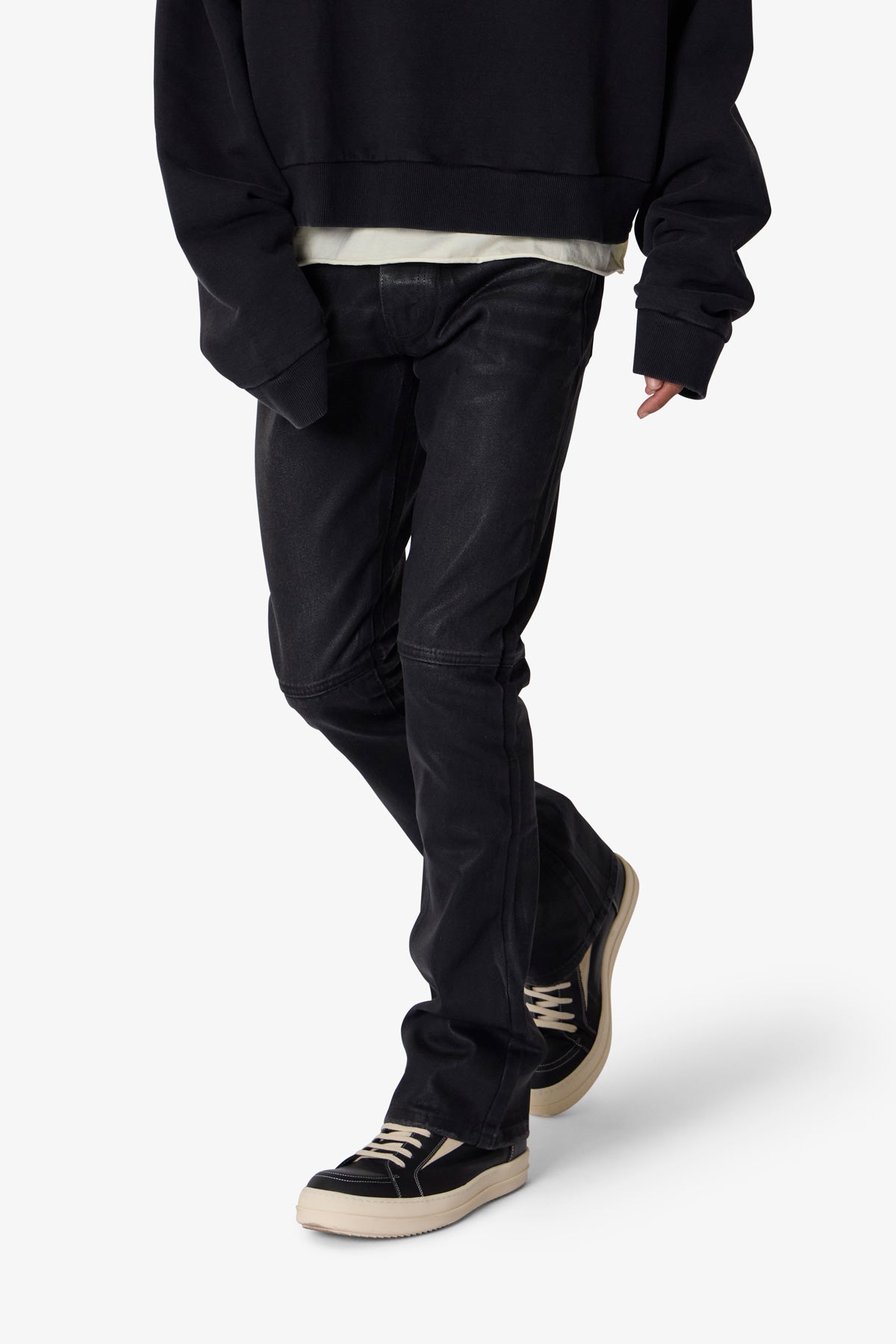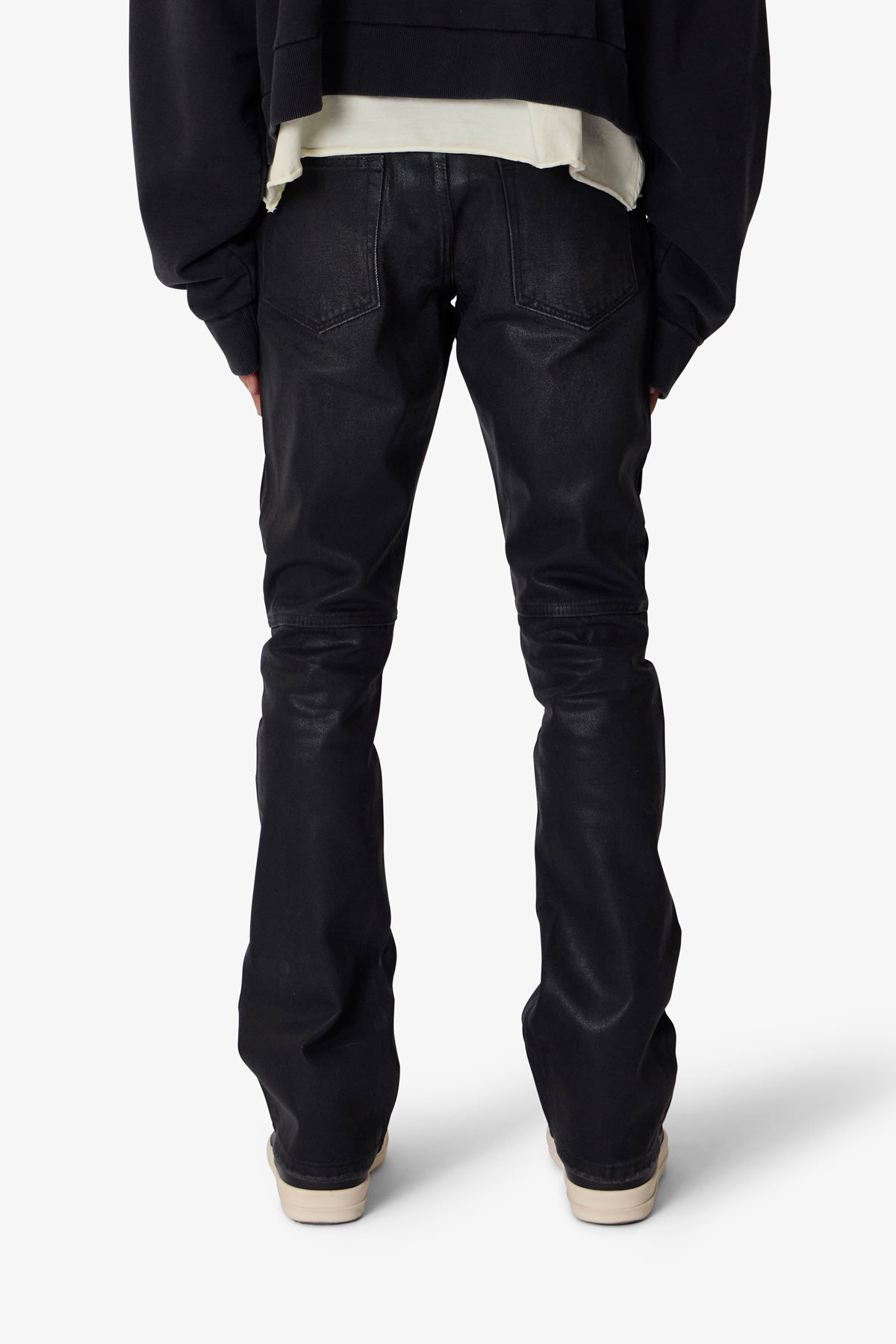 The B729 Waxed Denim features a bootcut silhouette with a fitted upper block, slim thigh, and a flare at the leg opening. Constructed from 100% cotton denim, it is treated with a black wash and finished with a wax coating. Design elements include paneled knee construction, whispering details, and a lightly distressed hem.