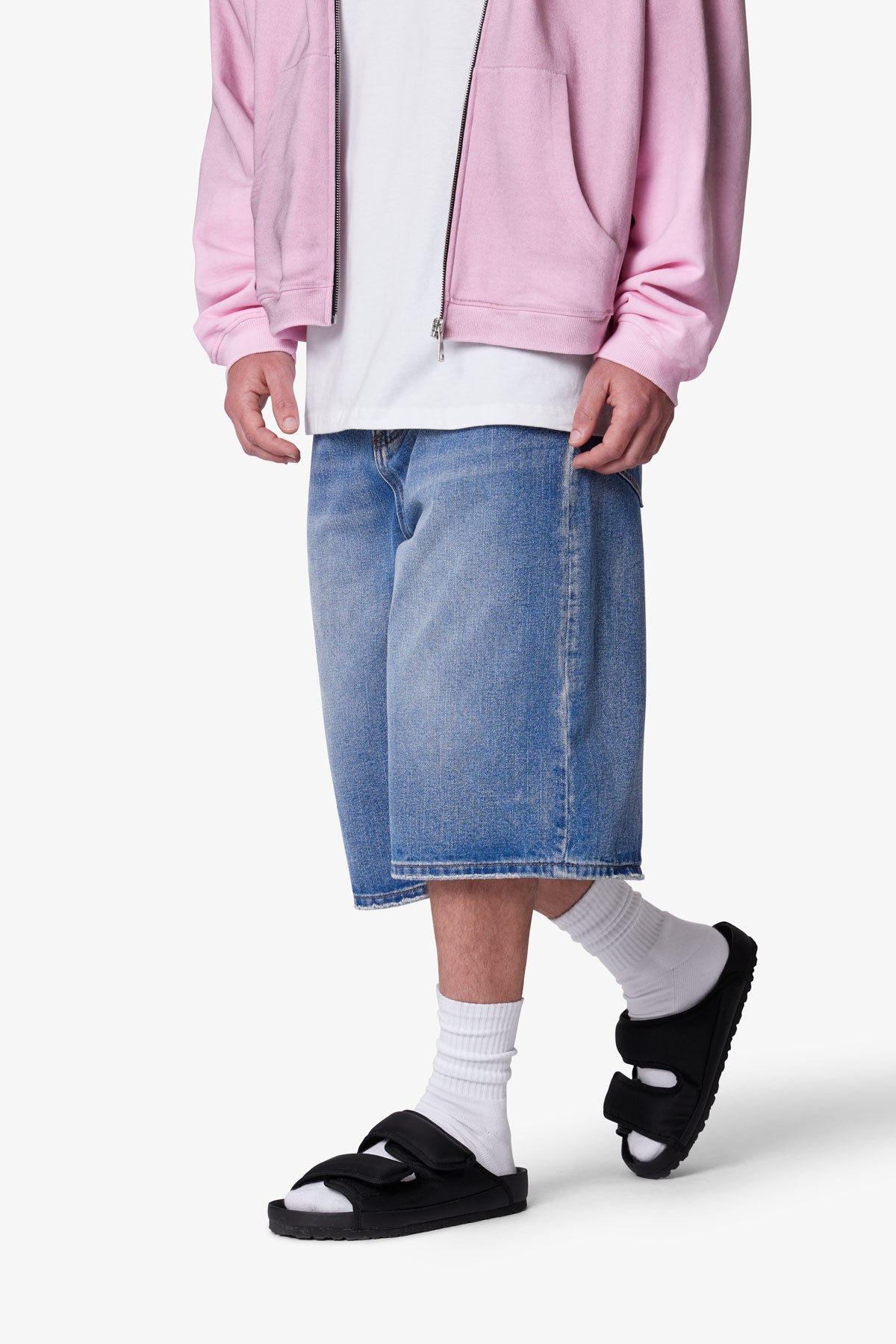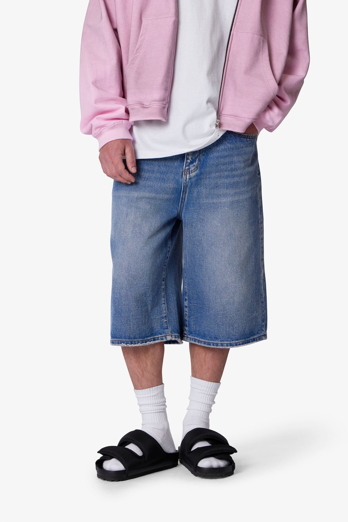Constructed from a cotton-poly blend, these denim shorts feature a vintage blue wash with subtle front whiskering and fading. Designed with a baggy, wide leg fit and a finished hem with light distressing. Includes a classic five-pocket layout, standard belt loops, and a front button fly.