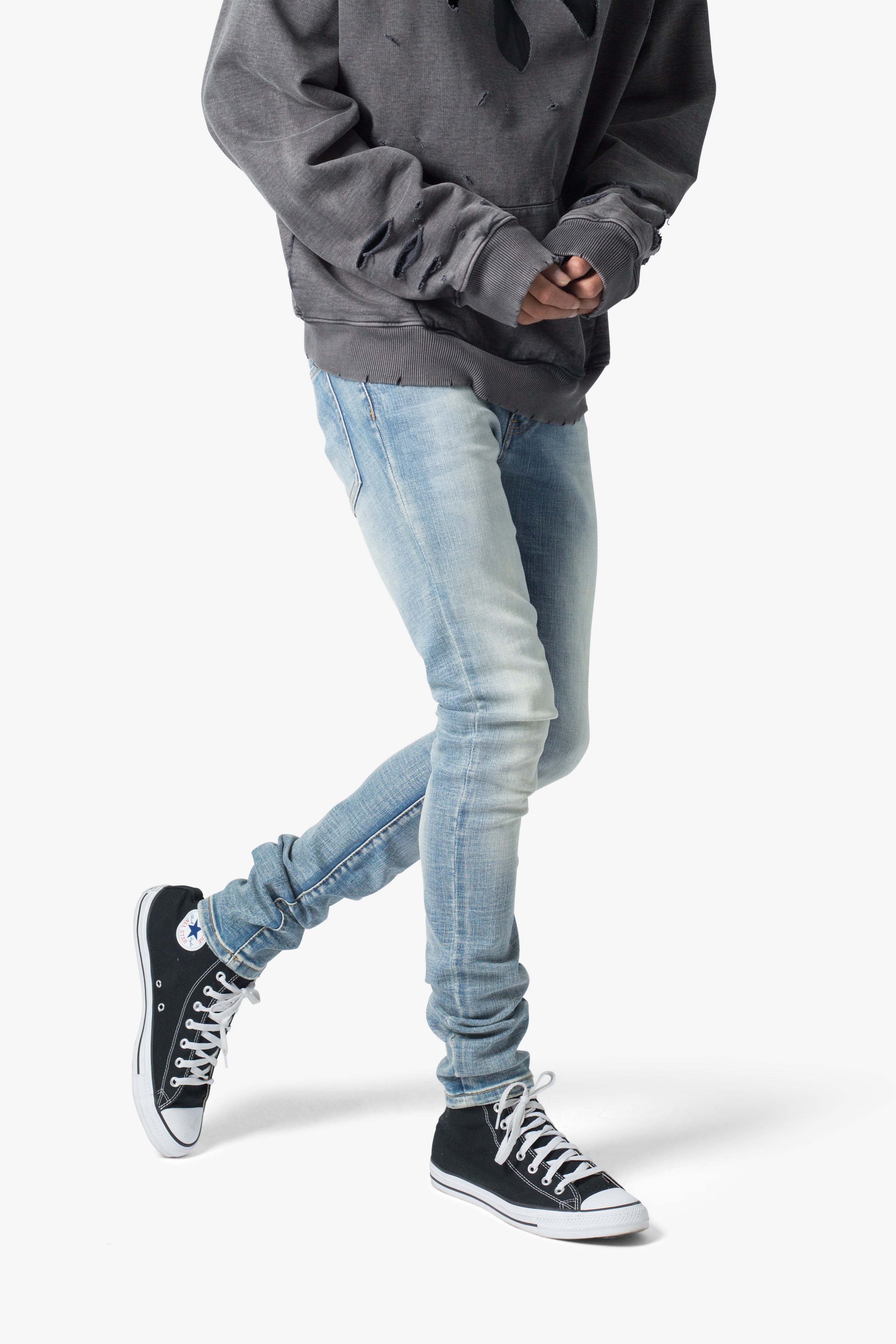the X494 Skinny Denim is designed with our new X fit which is skinny throughout with an extended inseam for stacking, and features a light blue wash, and finished with sanding and whiskering throughout.