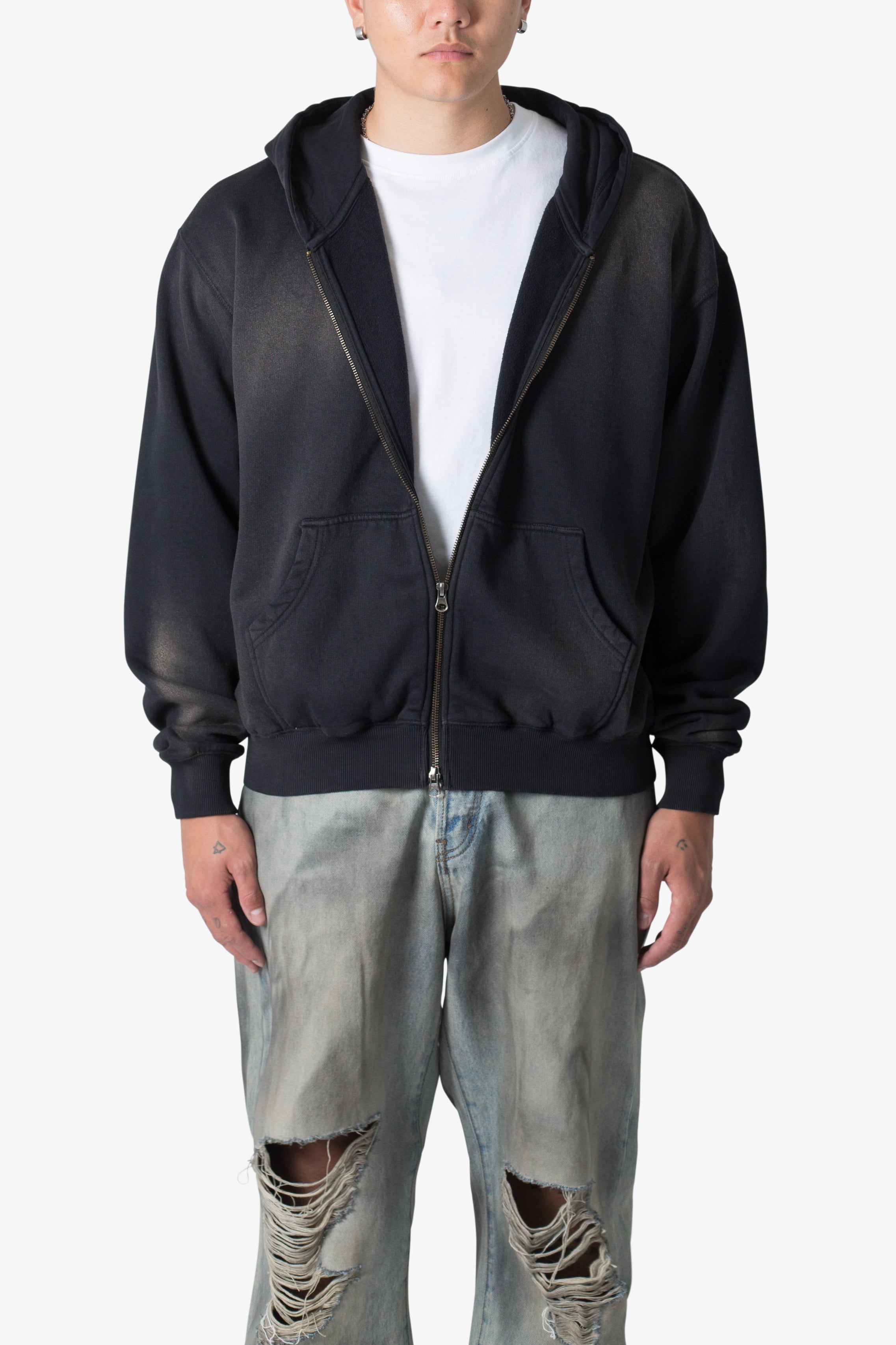 the Faded Basic Zip Hoodie is designed from 100% cotton fleece, with a T8 metal zipper at the chest, a kangaroo pocket that is split onto both sides, and is finished with a faded garment wash.