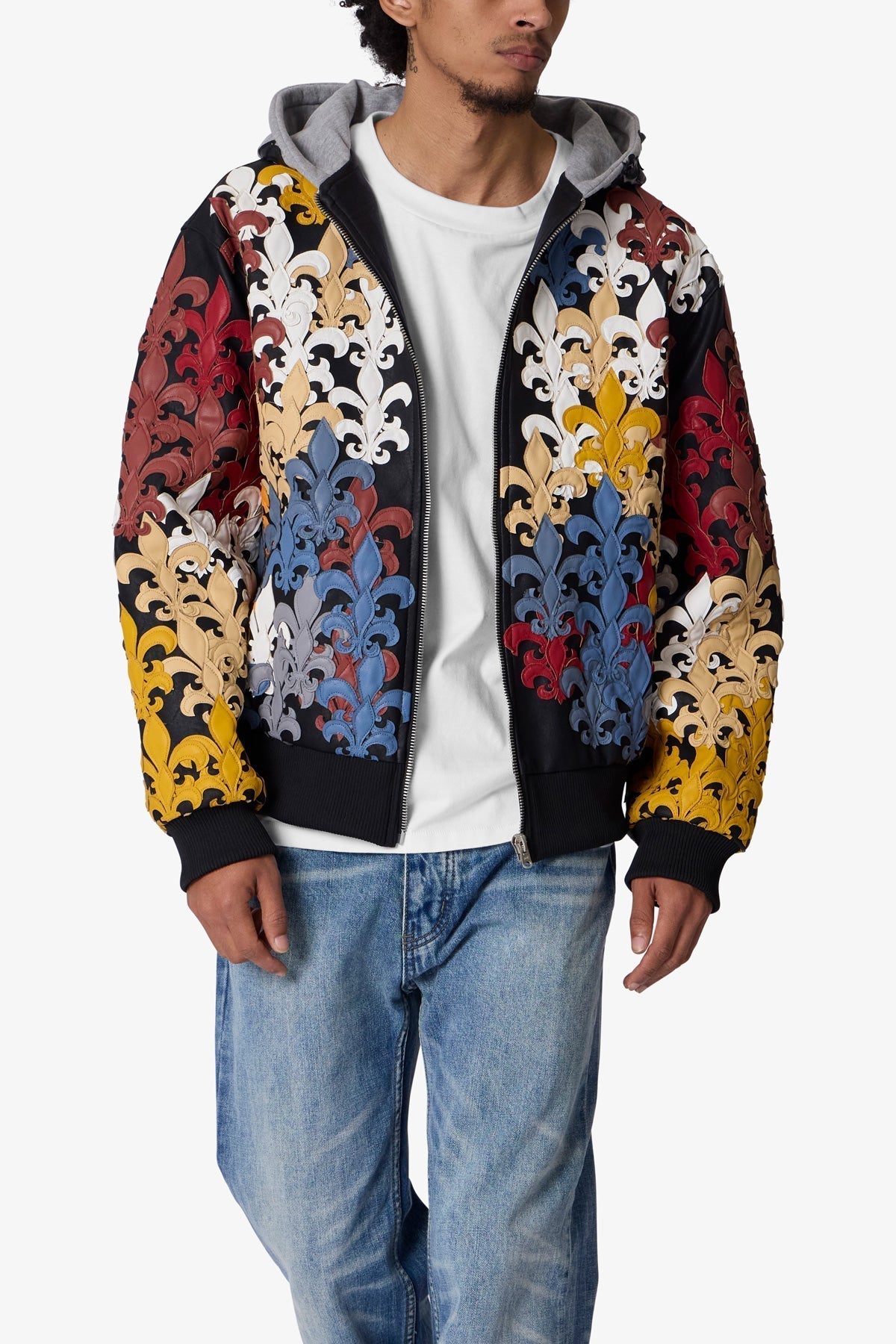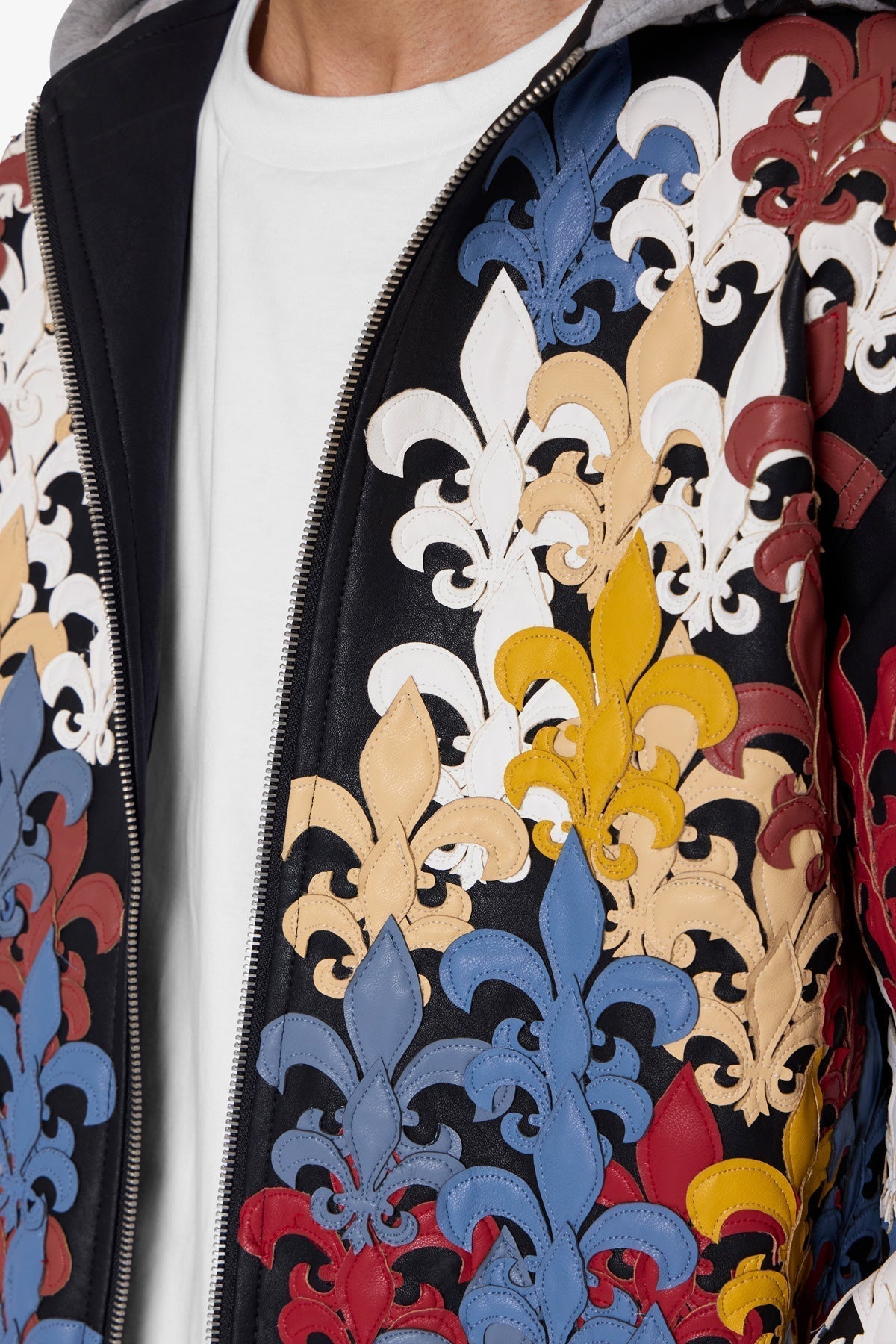 the Fleur De Lis All Over Hoodie is made from heavy weight synthetic leather fabric in an oversized fit, tonal ribbing at the waist and wrists, zipper placket at the chest with snap closures a hood constructed from fleece, a tonal lining, and finished with all over and multi colored fleur de lis patches through out the jacket and the hood.