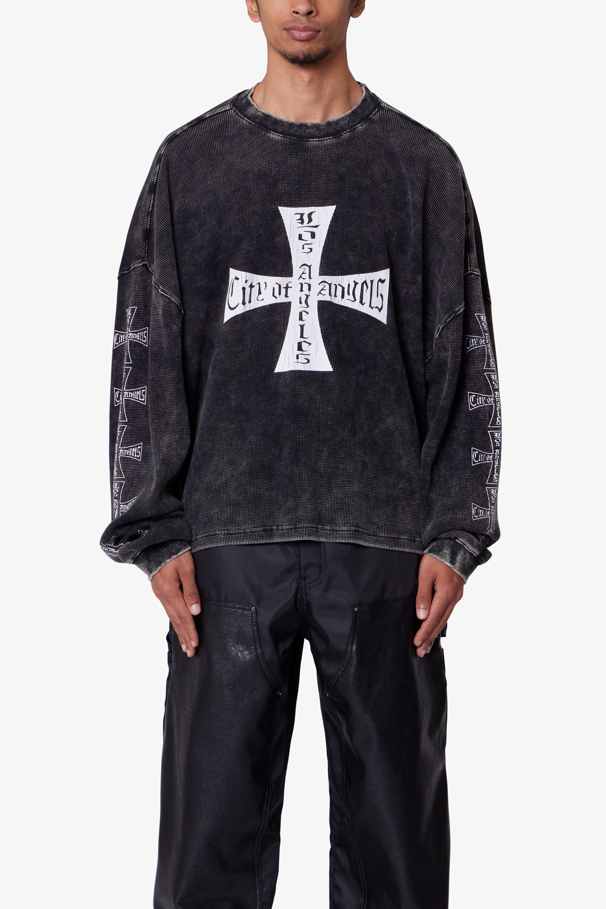 The Washed LA Thermal Shirt is constructed from 100% cotton in a mid weight waffle knit. Treated with a heavy acid wash for a worn vintage effect, this long sleeve thermal features cracked and distressed chest and sleeve graphics inspired by vintage motorcycle wear.